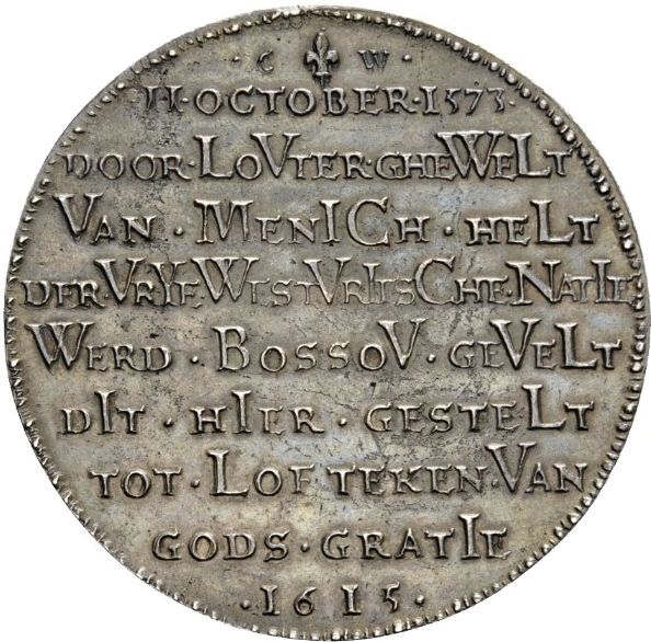 11.OCTOBER.1573. / DOOR.LOVTER.GHEWELT / VAN.MENICH.HELT / DER VRYE WESTVRIISCHE.NATIE / WERF BOSSOV.GEVELT / DIT.HIER.GESTELT / TOT.LOFTEREN.VAN / GODS GRATIE /.1615
