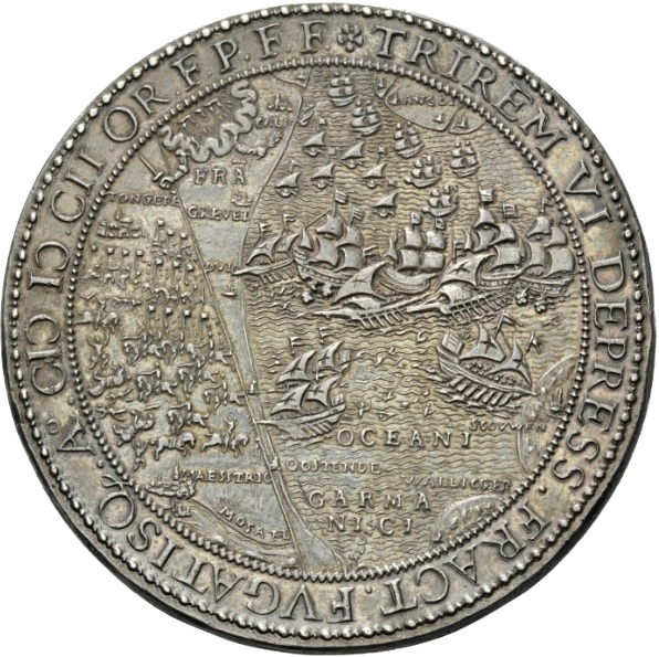 Опис: Дві сцени: кавалерійський бій поблизу Маастрихта та морська битва біля Гудвін-Сендс; позначені місця. Над кожною з них, відповідно, зображено руку, що виходить з небесних хмар і тримає меч, та блискавку.