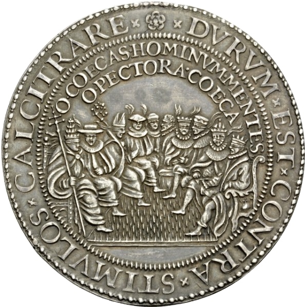 Опис: Філіп II Іспанський та католицькі глави Церкви й держави, з зав'язаними очима, сидять за столом, ведуть дискусію, а їхні ноги стоять на підлозі, вкритій шипами.