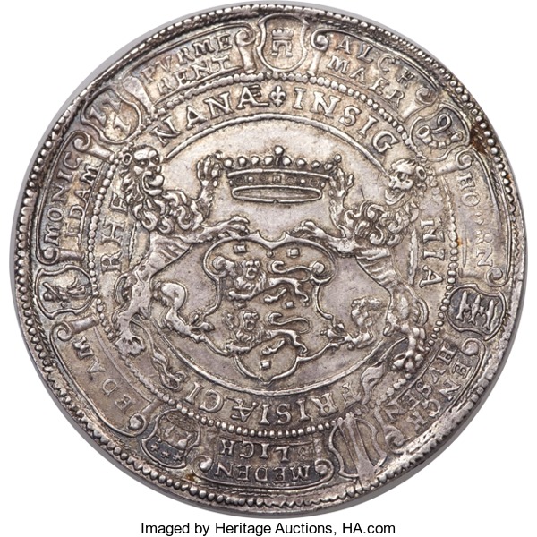 Опис: Іврит JEHOVAH у хмарах над портом на горизонті, бог моря Нептун їде на морському чудовиську на передньому плані, латинська легенда «Нехай королівства Нептуна процвітають під щасливими зірками».