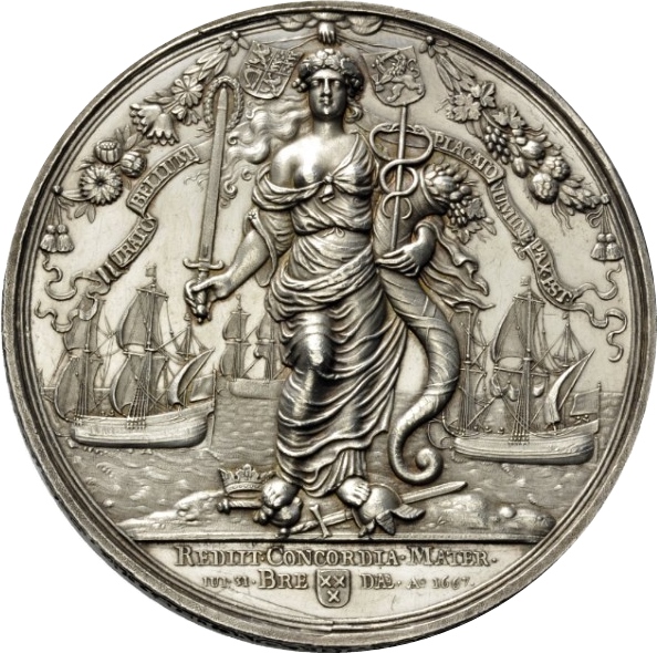 Опис: Голландія, в шоломі та частково в обладунках, стоїть між ягням і левом, лівою ногою топчучи фігуру Дискордії, напівголої старенької з головою горгони, що лежить перед нею; позаду неї праворуч — голландські військові кораблі, що пливуть ліворуч; ліворуч — британські військові кораблі, що горять; позаду — палац у Бреді