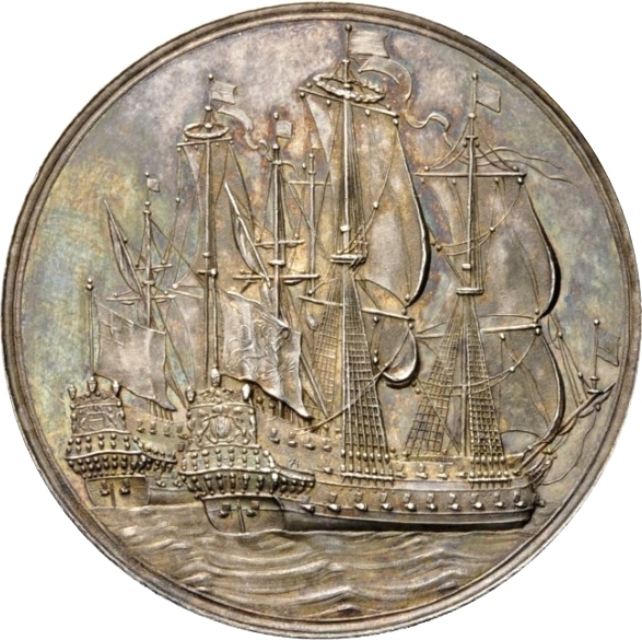 Опис: Голландський та англійський військові кораблі, що дружньо пливуть праворуч; на вершині грот-щогли кожного з них — оливковий вінок