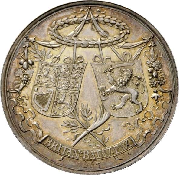 Опис: Щити Великої Британії та Голландської Республіки, що звисають з оливкового вінка; під щитами — перехрещені та зв’язані гілки лавра та пальми, а також стрічка.