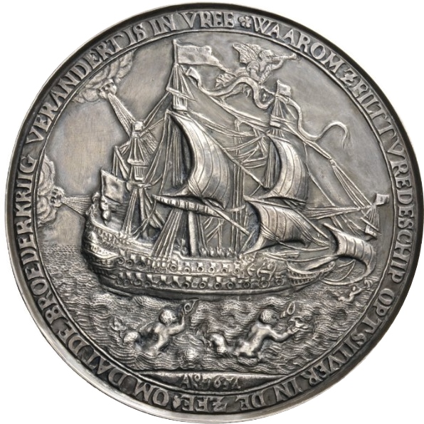 Опис: Пакс стоїть між Голландією та Британією, об’єднуючи їхні списи, на вершині кожного з яких розміщено капелюх Свободи; поля монети вкриті квітковим орнаментом
