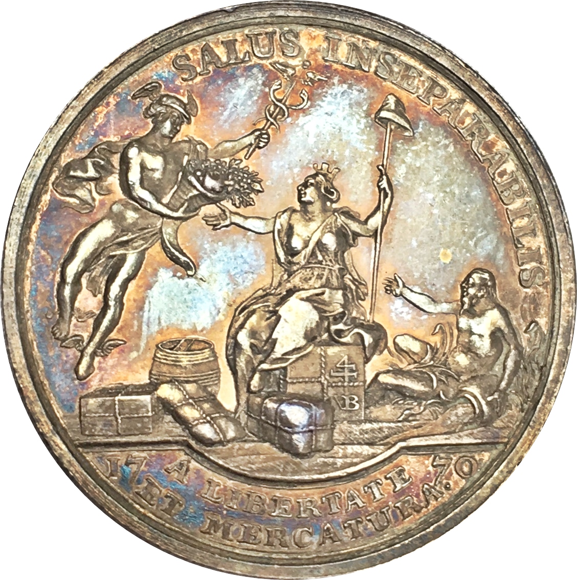 Опис: Богиня міста Роттердама, що тримає жердину з капюшоном свободи, сидить на тюках, а праворуч від неї летить Меркурій, тримаючи кадуцей та ріг достатку, а ліворуч сидить бог річки Ротте, тримаючи переповнену урну.