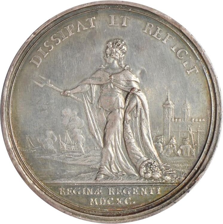Опис: Марія як Британія зображена з тризубом і рогом достатку, зліва — морська битва, праворуч — адмірал лорд Торрінгтон, якого супроводжують до Тауера.