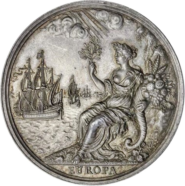 Опис: Європа, у вінку, сидить ліворуч на березі моря, тримаючи оливкову гілку та ріг достатку, вдалині — кораблі.