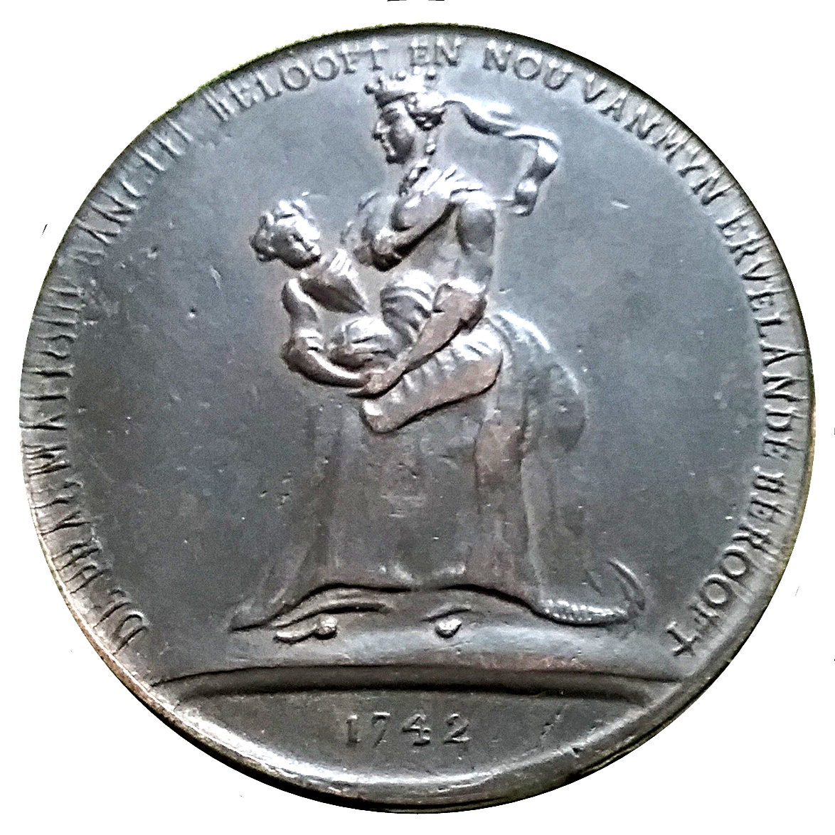 Опис: Жінка (Марія Терезія) тримає на руках немовля (майбутнього спадкоємця Йосифа II).