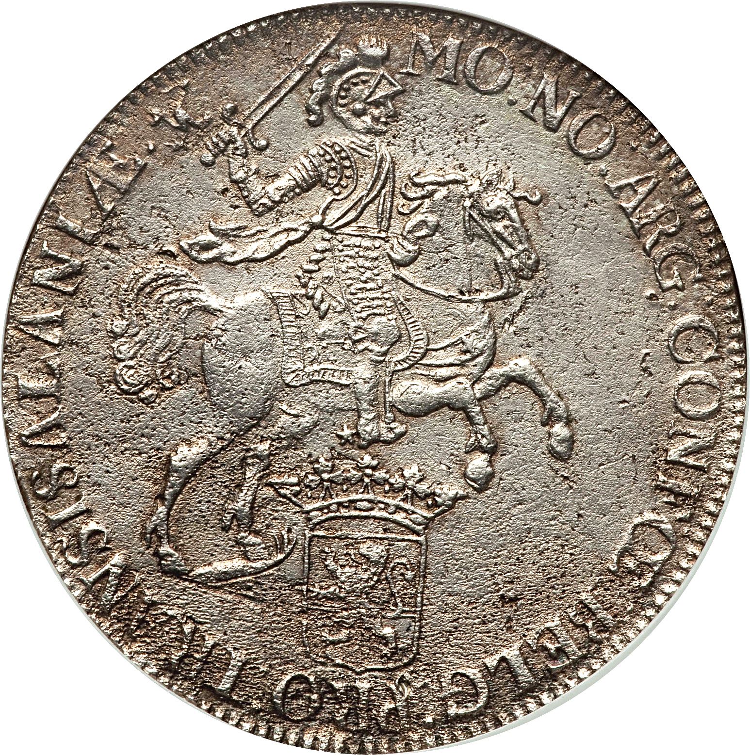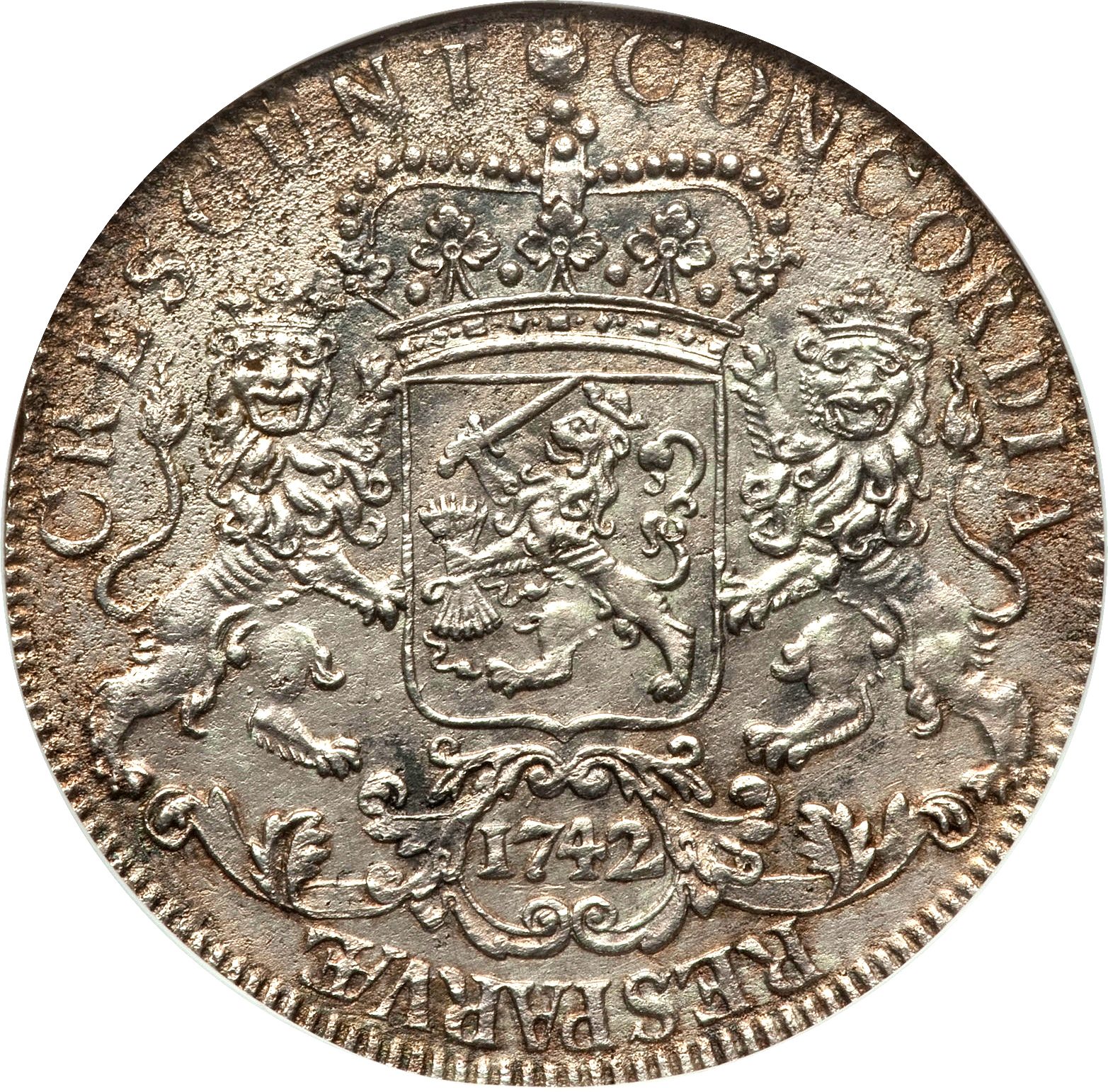 Опис: Коронований герб Об'єднаних провінцій, підтриманий з обох боків коронованим левом, датований під щитом у картуші.