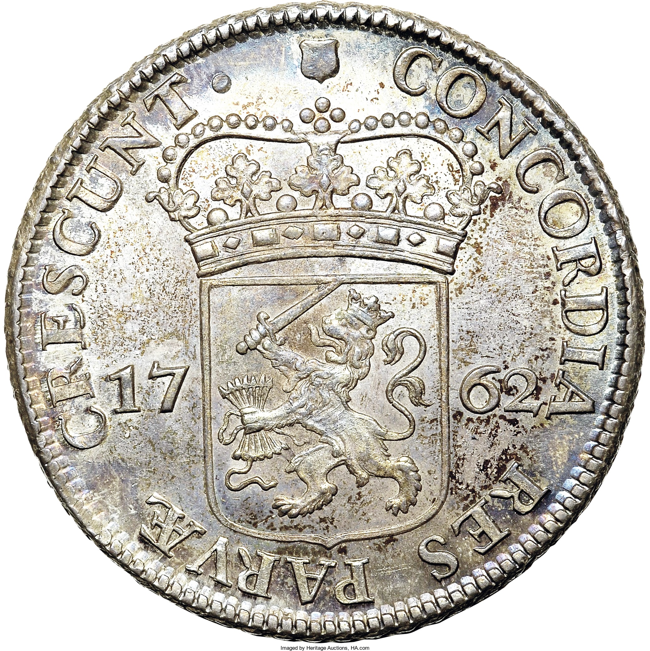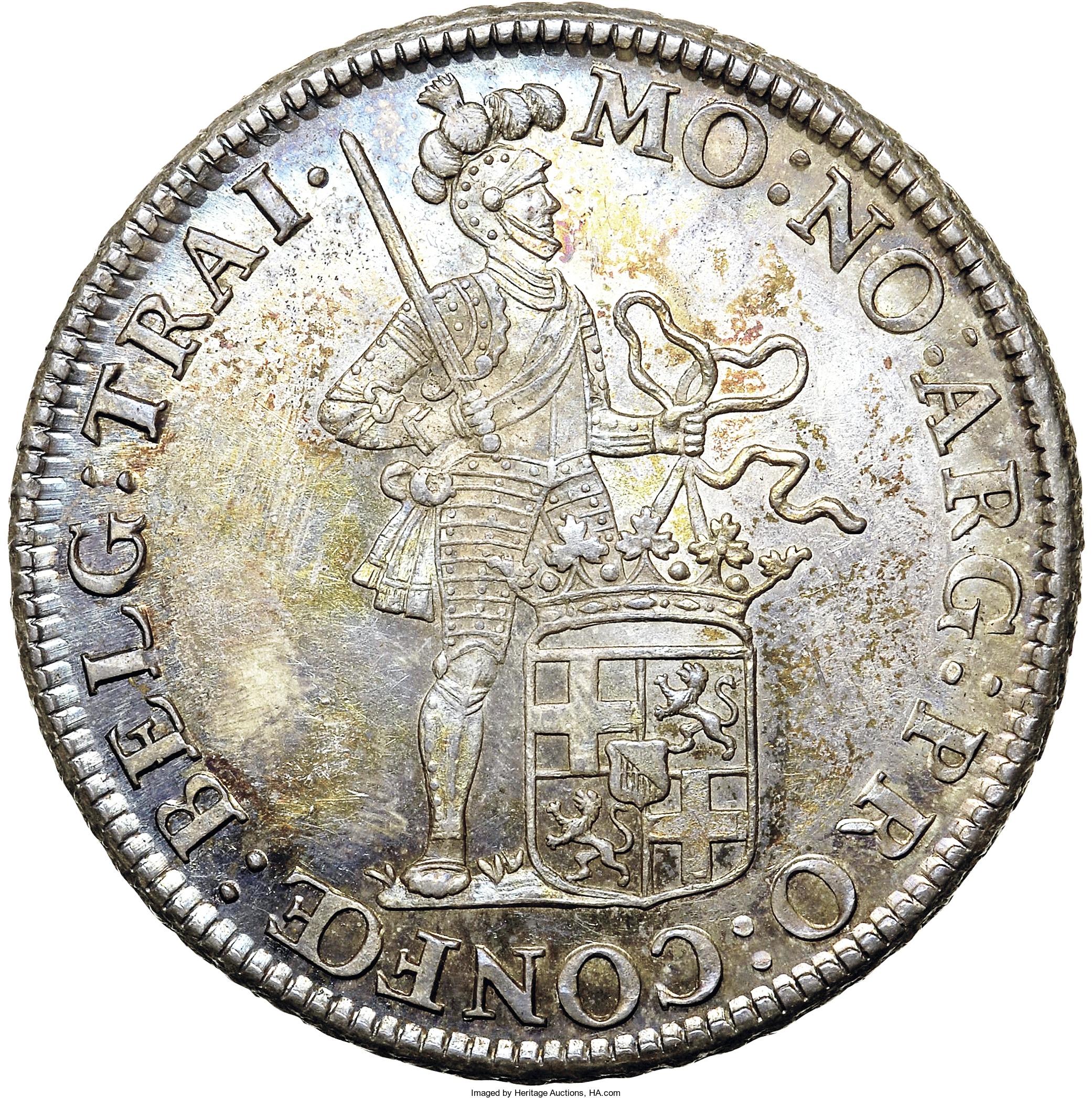 Опис: Коронований герб Об'єднаних провінцій розділяє дату. Малий герб Утрехта над короною.