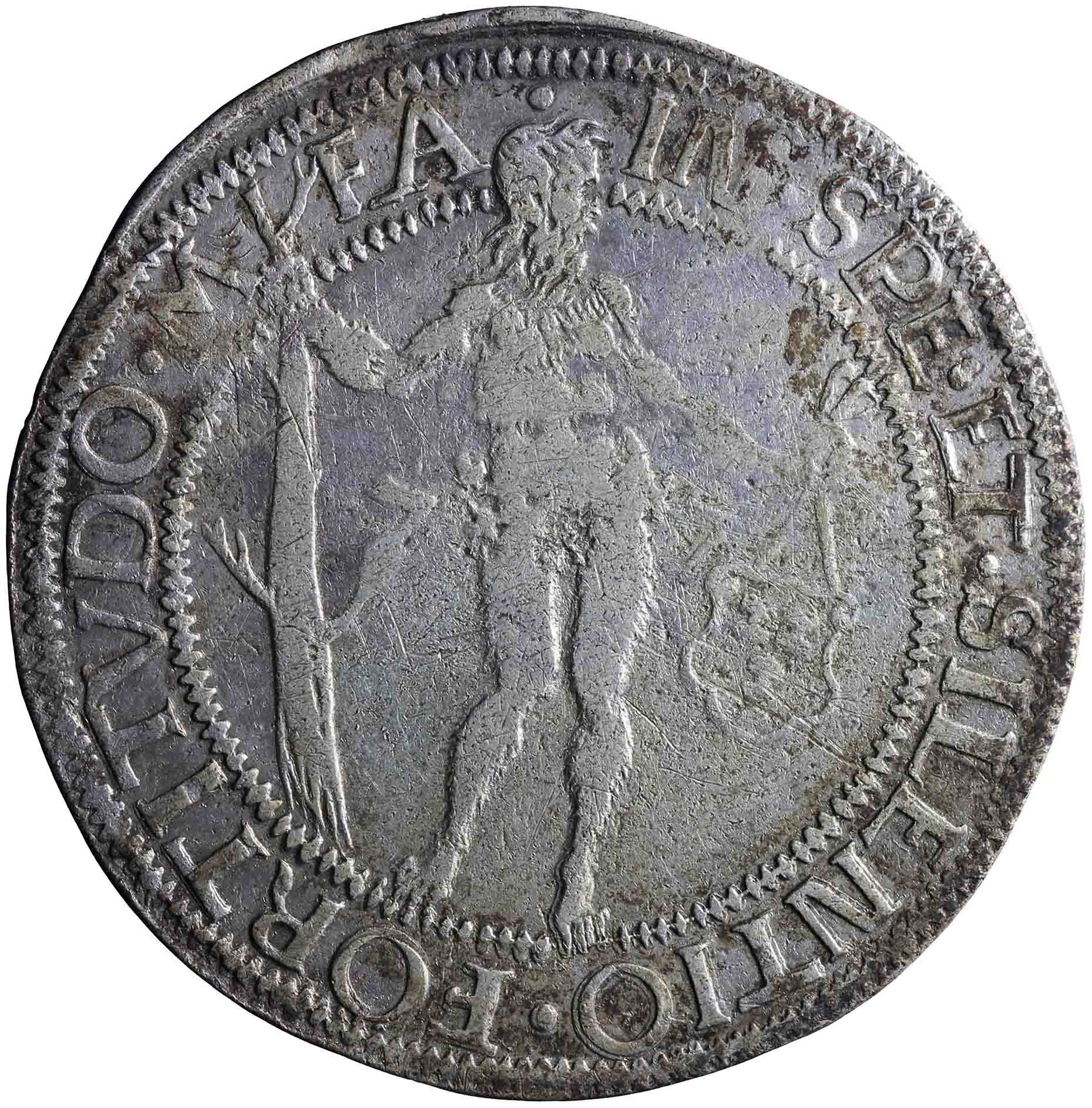 Опис: Дикун, що розділяє двозначну дату в полі, тримаючи стовбур дерева в правій руці та руки Віанен в лівій, всередині внутрішнього рифленого кола.