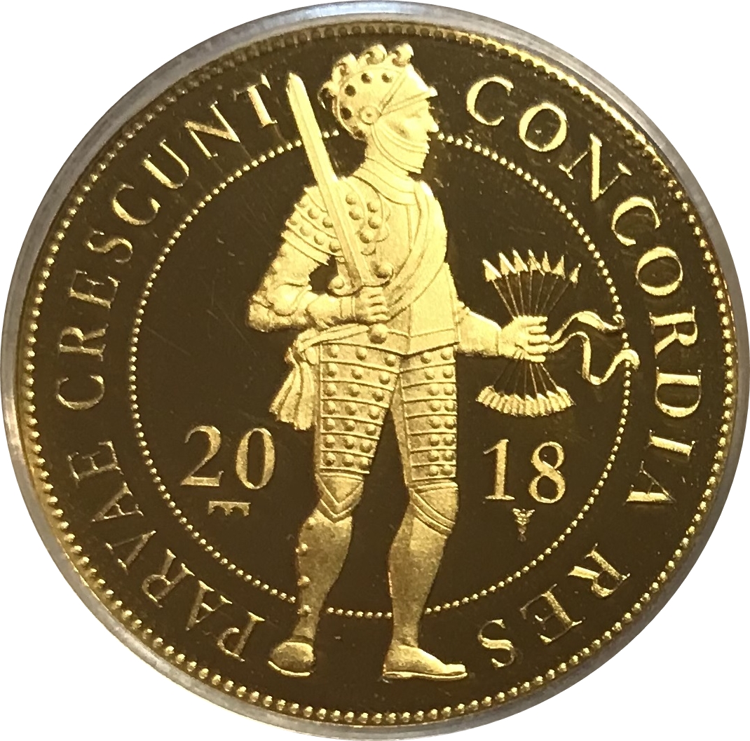 Опис: Нове трактування зображення лицаря в обладунках на основі оригінального дизайну 1777 року гравера Йогана Віллема Марме, який був гравером на монетному дворі в Утрехті з 1763 по 1795 рік. Ця монета має додаткове кільце з перлин всередині легенди (відмінність від одинарного дуката).