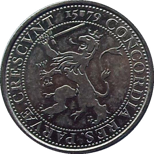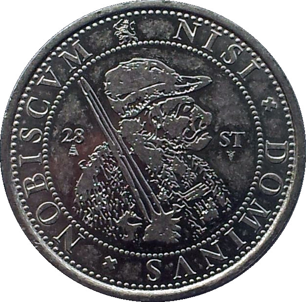 Опис: Випущена Флоріном Єневером; виготовлена «de Koninklijke Nederlandse Munt» (Королівським монетним двором Нідерландів). Створена на основі дизайну флорінів 17 століття Республіки Семи Об'єднаних Нідерландів (Нідерландської Республіки). Погруддя шляхтича в каптурі праворуч, який тримає меч між 28 - ST в перловому колі.
