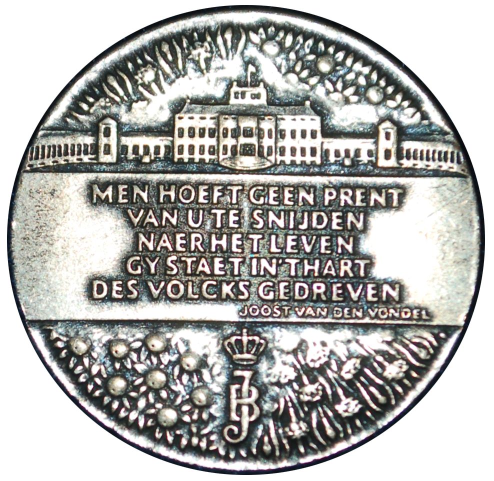Опис: Поле розділене на три частини. У верхній частині зображено палац, у центральній частині — вірш поета Йоста ван ден Вонделя, у нижній частині — коронований спільний монограм JB. Верхня та нижня частини прикрашені яблуками, апельсинами та гвоздиками.
