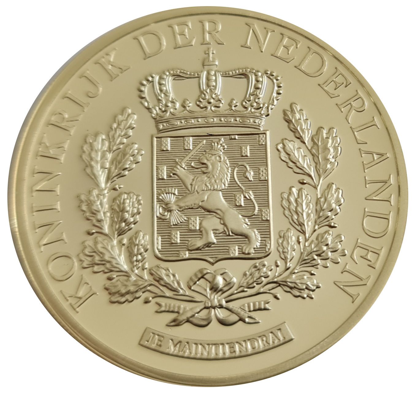 Опис: Герб Королівства з написом «Королівство Нідерландів» по краях та написом «Je maintiendrai (Я збережу)» під гербом.