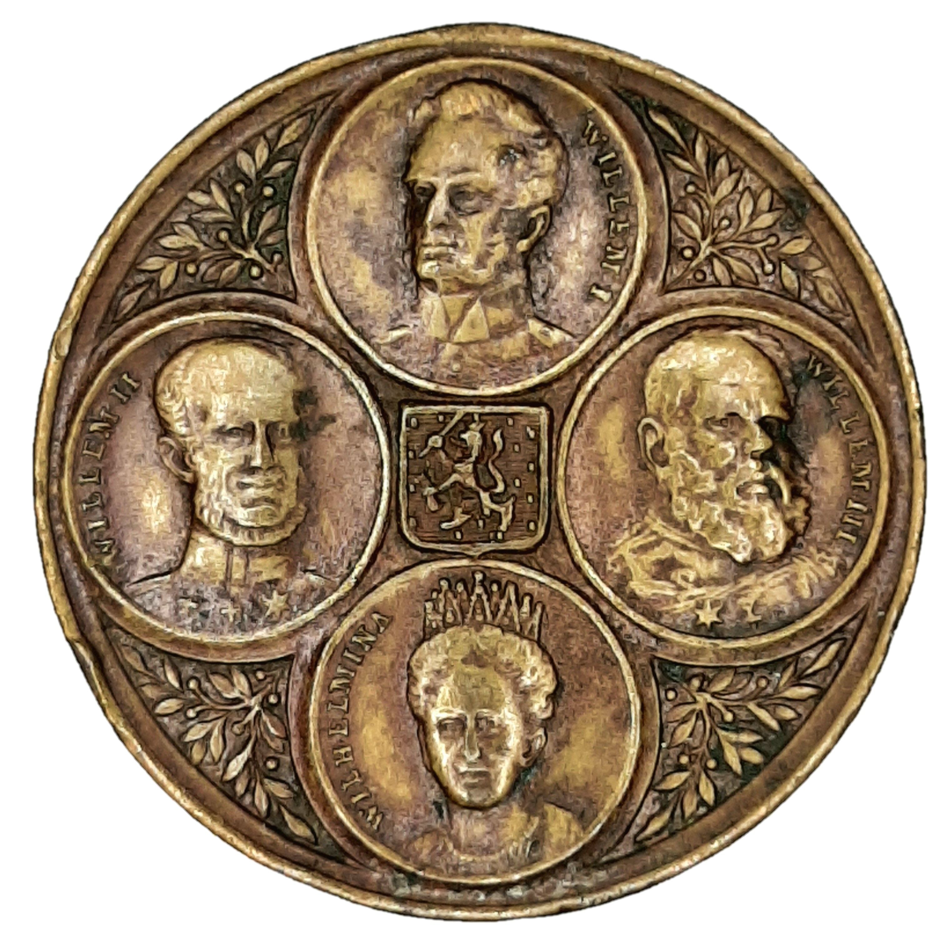 Опис: У центрі — невеликий герб Нідерландів, оточений головами трьох королів і однієї королеви Нідерландів у окремих медальйонах.