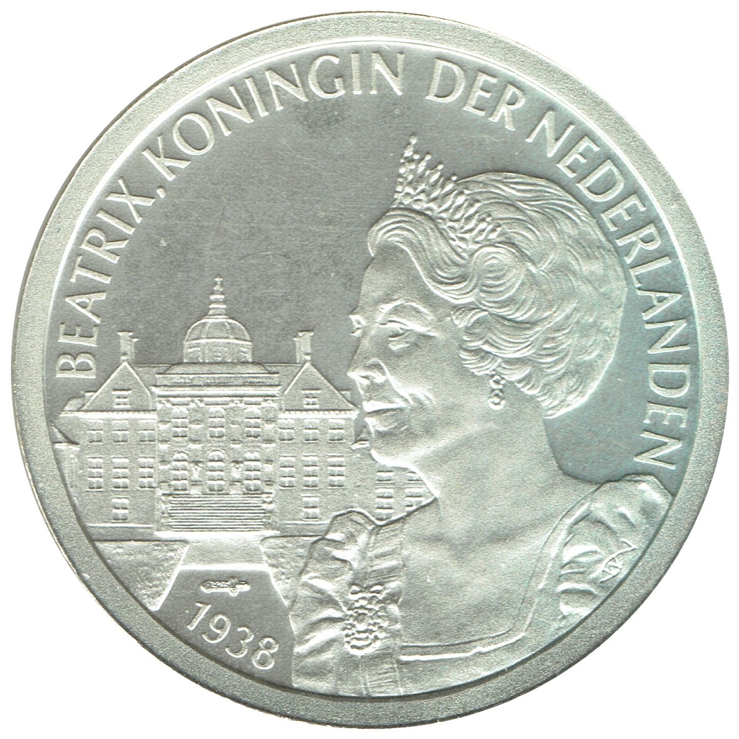 Опис: Портрет королеви Беатрікс, звернений вліво, перед Королівським палацом. Срібна позначка .925 над роком народження.