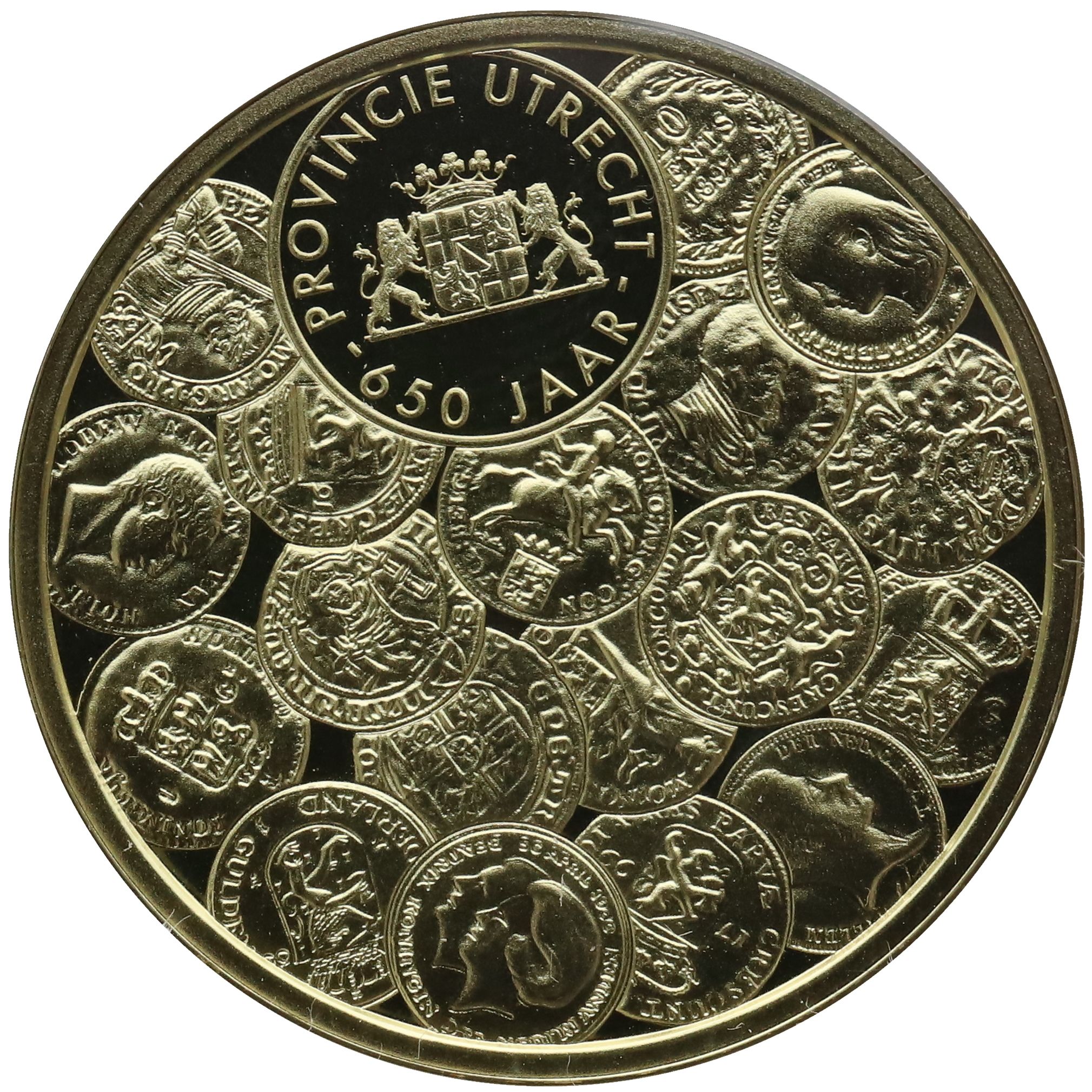 Опис: Монети, випущені Монетним двором протягом століть. У верхній частині — медаль з гербом провінції Утрехт та текстом.