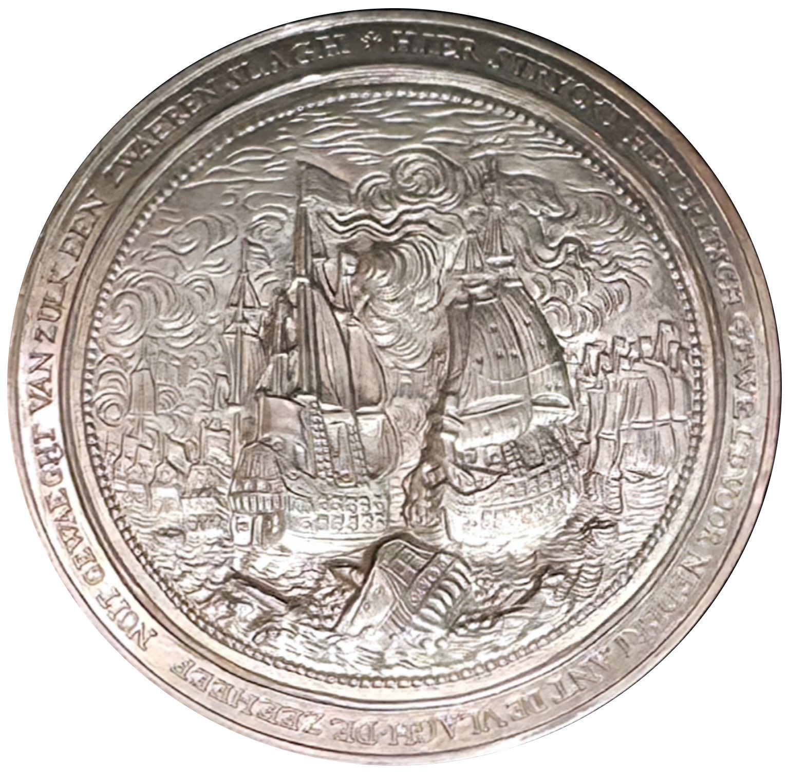 Опис: На аверсі зображено бюст Де Руйтера в обладунках, злегка повернутий управо, увінчаний двома тритонами, з гербами та прапорами по боках.