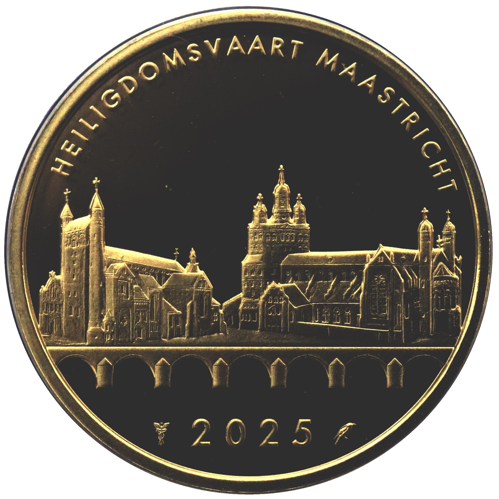 Опис: Базиліка Святого Серваса (праворуч) і Базиліка Богоматері (ліворуч). Обидві, так би мовити, підтримуються мостом Святого Серваса. Навколо зображено напис «Heiligdomsvaart Maastricht 2025». Позначка монетного двору та позначка майстра монетного двору зображені поруч із роком.
