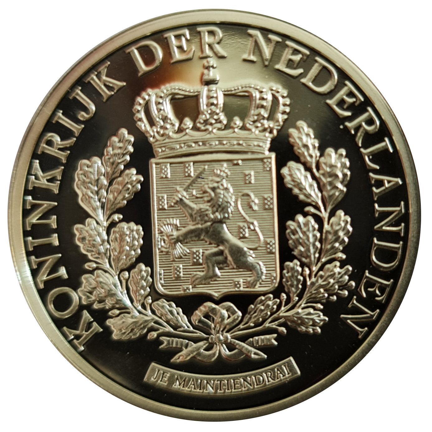Опис: Герб Королівства з написом «Королівство Нідерландів» по краю та написом «Je maintiendrai (Я збережу)» під гербом.
