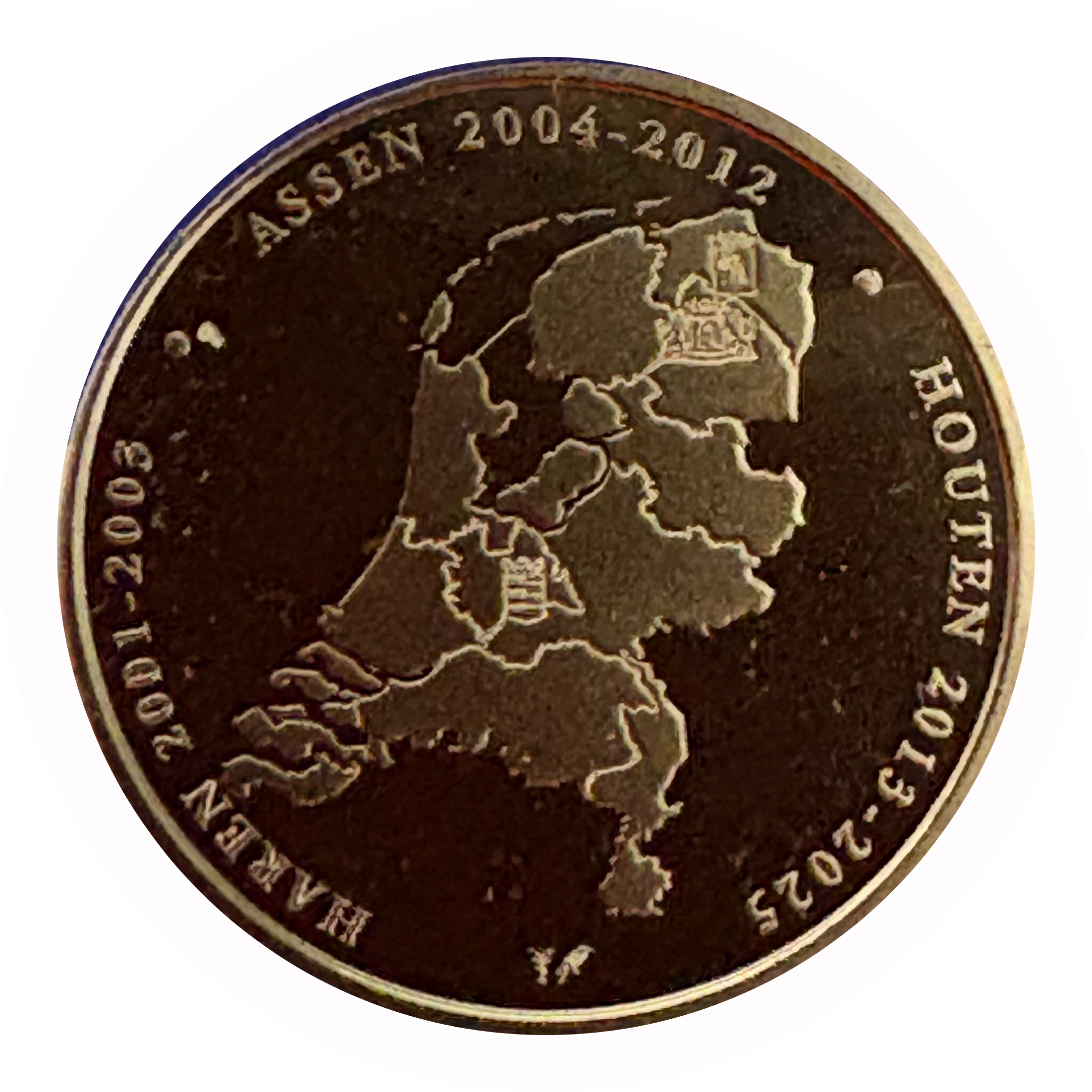 Опис: Карта Нідерландів, оточена датами та місцями, де відбувалася виставка монет: Харен (2001-2003), Ассен (2004-2012) та Хаутен (2013-2025). Карта також містить герби цих міст.