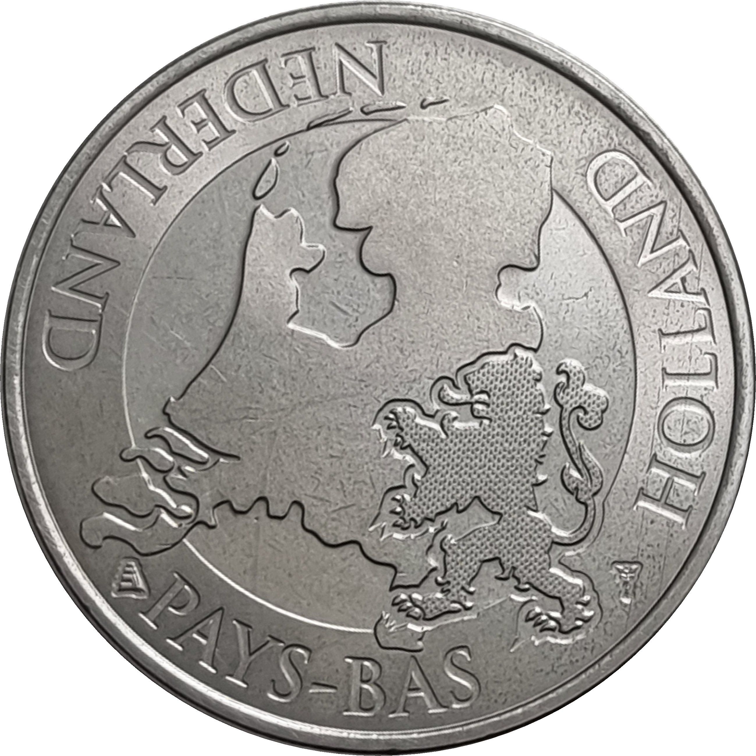Опис: Силует карти Нідерландів та символ лева (використовується в голландській геральдиці протягом століть). Навколо розміщено назву країни французькою, голландською та англійською мовами.