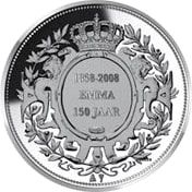Опис: Дати та центральний текст. Діапазон років для 150-річного ювілею та «Емма 150 років». Написи оточені декоративним королівським гербом із короною у верхній частині та квітковими/листяними елементами.