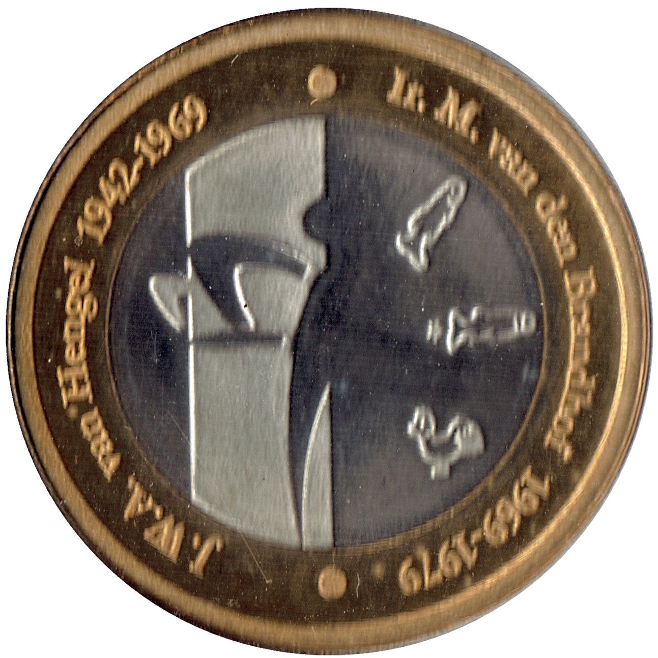 Опис: Частина логотипу Королівського монетного двору Нідерландів; три різні привілейовані знаки з минулого; імена колишніх майстрів монетного двору.