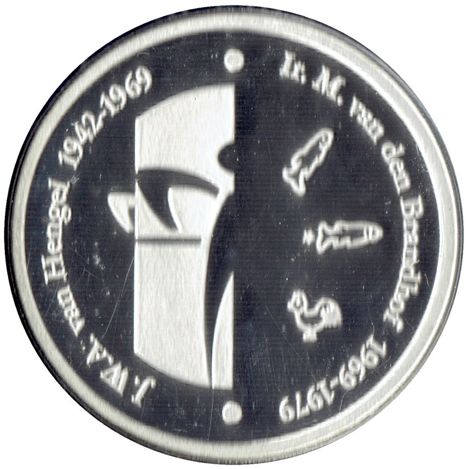 Опис: Частина логотипу Королівського монетного двору Нідерландів; три різні привілейовані знаки з минулого; імена колишніх майстрів монетного двору.