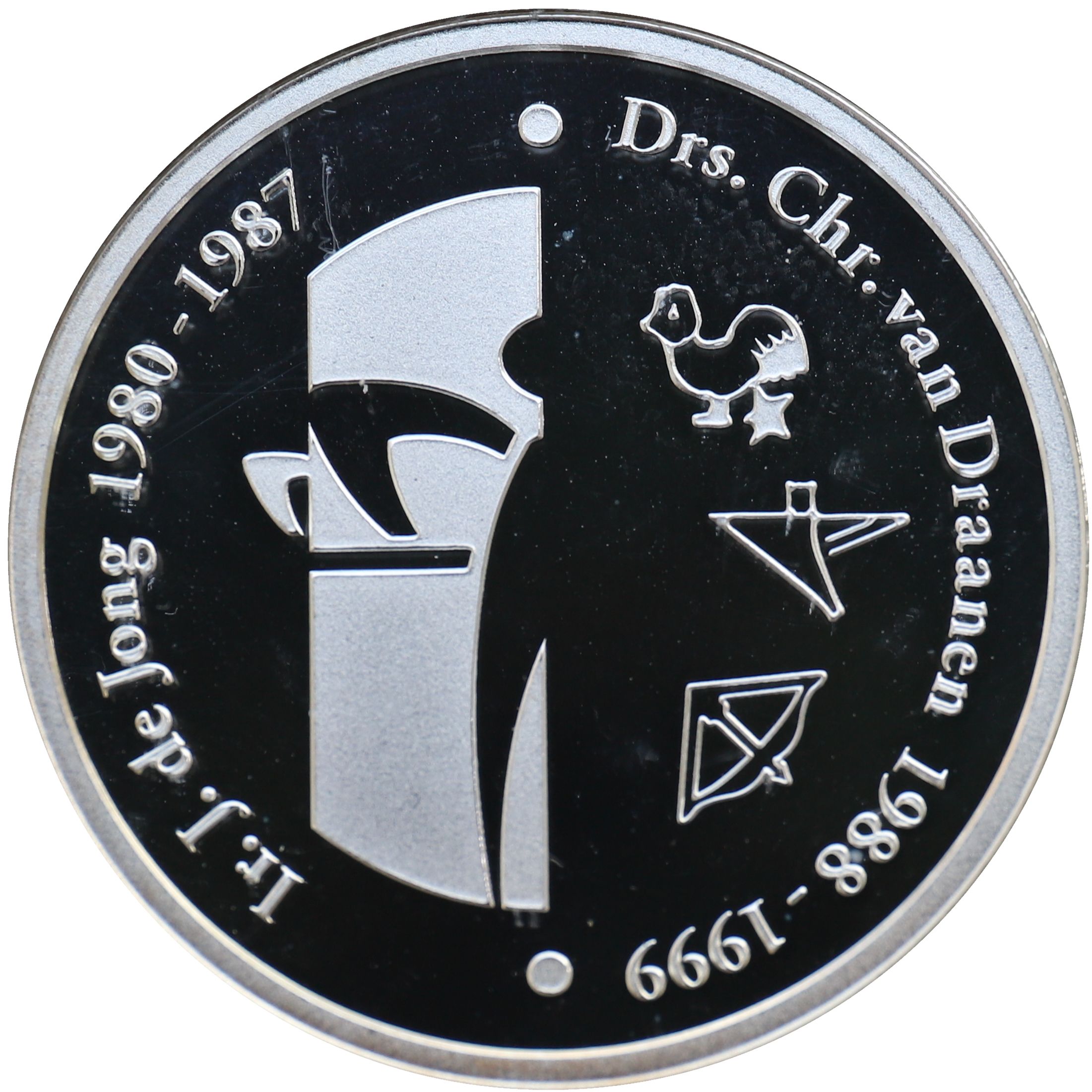 Опис: Частина логотипу Королівського монетного двору Нідерландів; три різні привізні знаки з минулого; імена колишніх монетних майстрів.