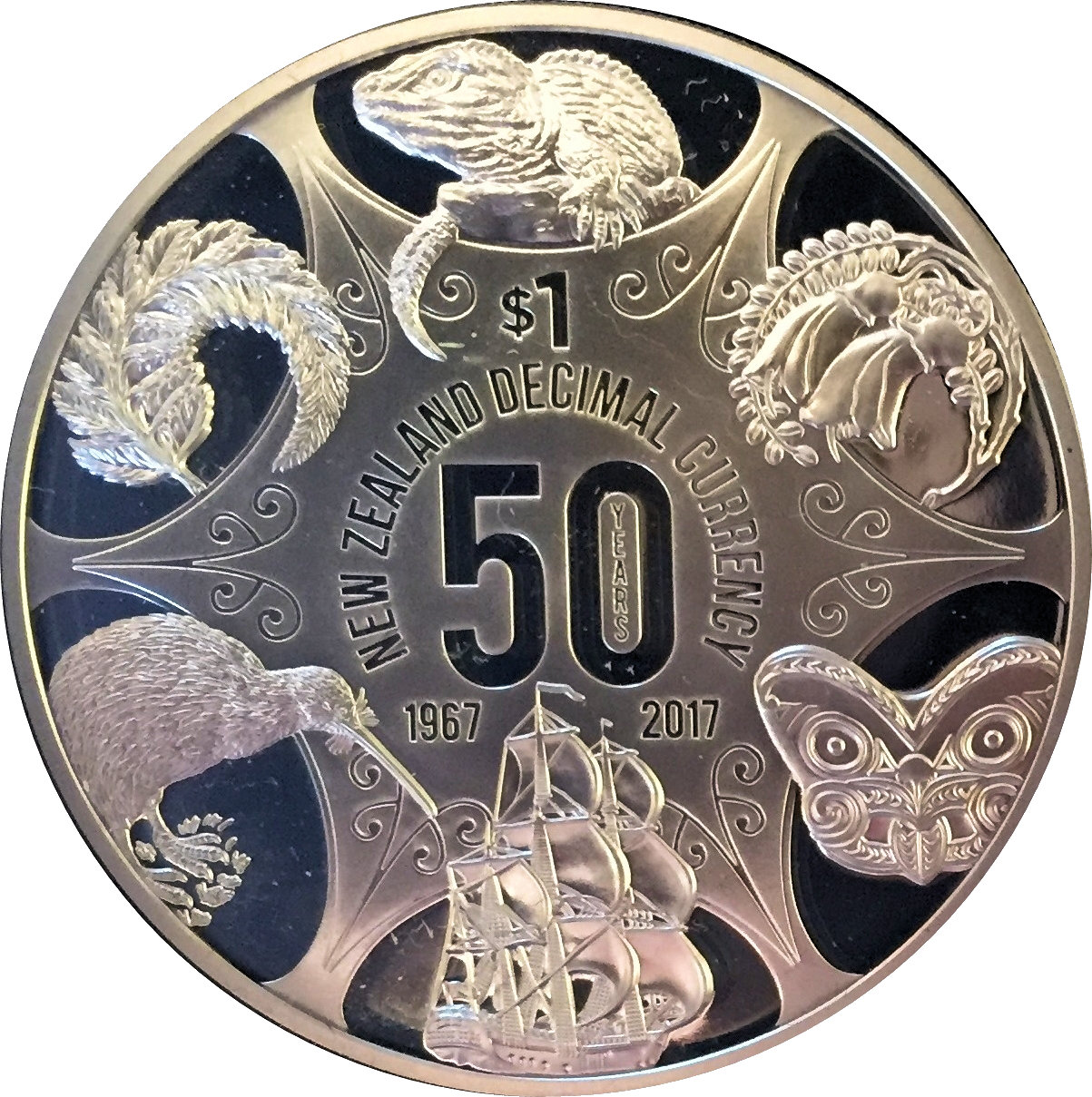 1 долар — Єлизавета II (4-й портрет; 50 років десяткової валюти) 2017 – 2017 Нова Зеландія