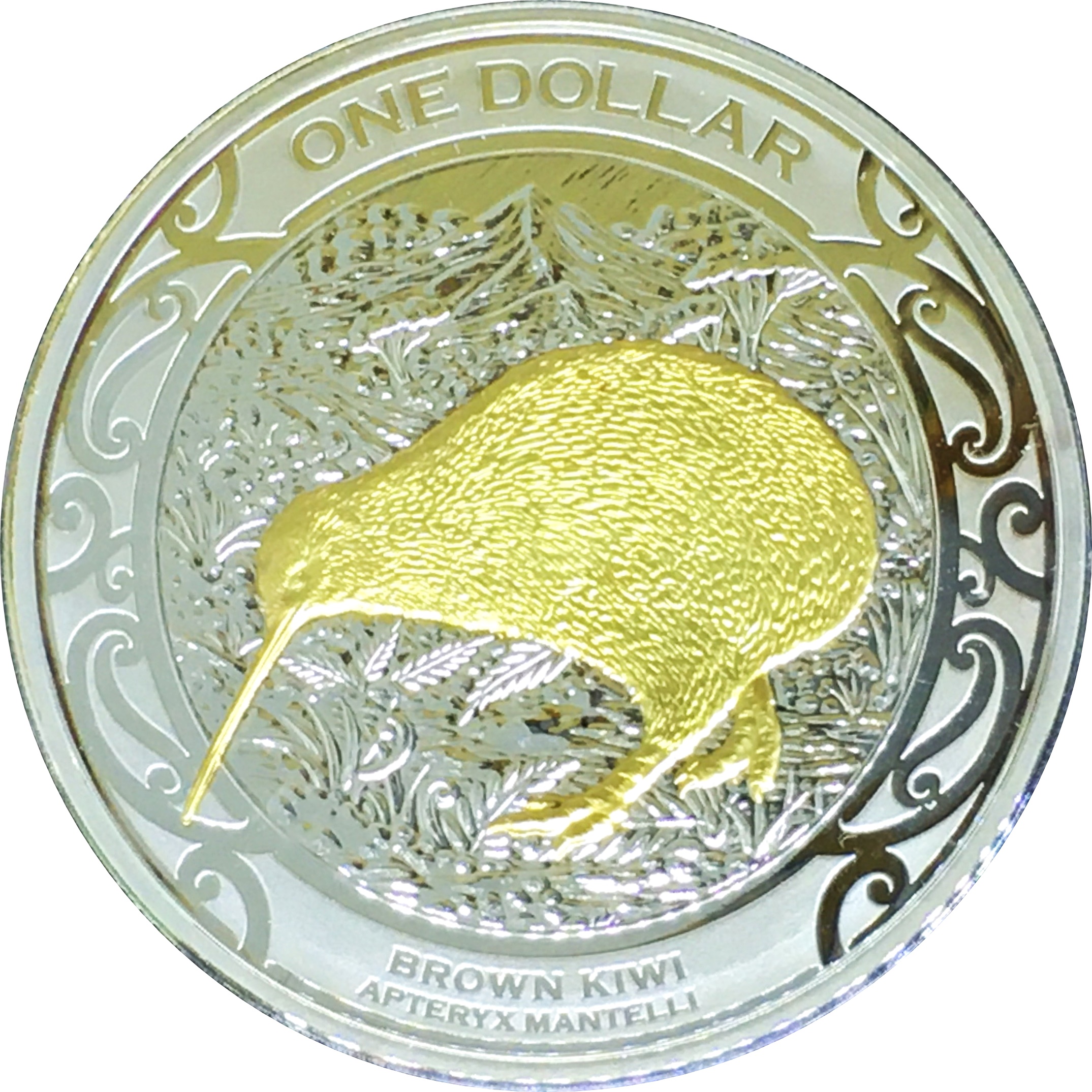Опис: Кольорове зображення коричневого ківі (Apteryx Mantelli), номінал зверху, легенда знизу.