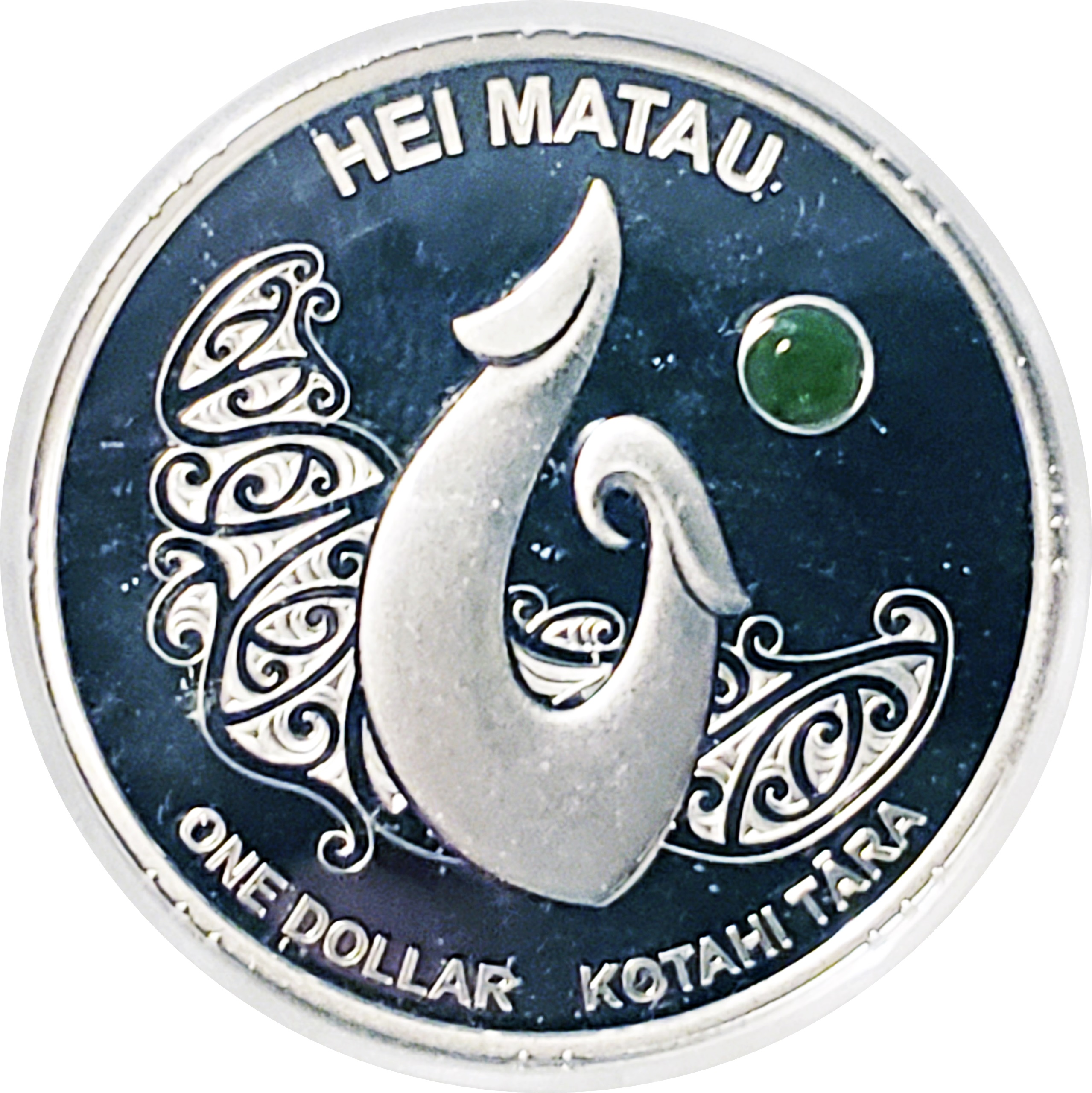 Опис: Хей Матау на тлі традиційного візерунка коухайваї. У монету вставлений шматочок поунаму (новозеландського зеленого каменю).