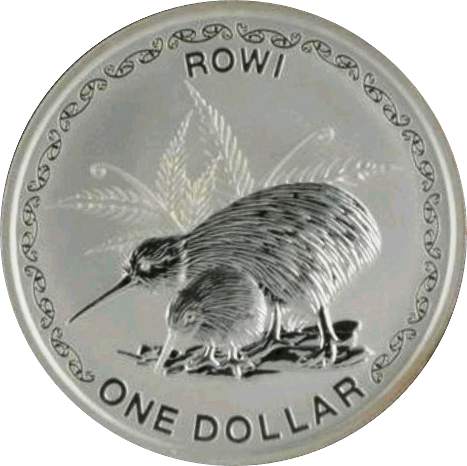 Опис: Рові Ківі з пташеням. Срібний папороть ззаду, оточений кільцем з маорійським візерунком.