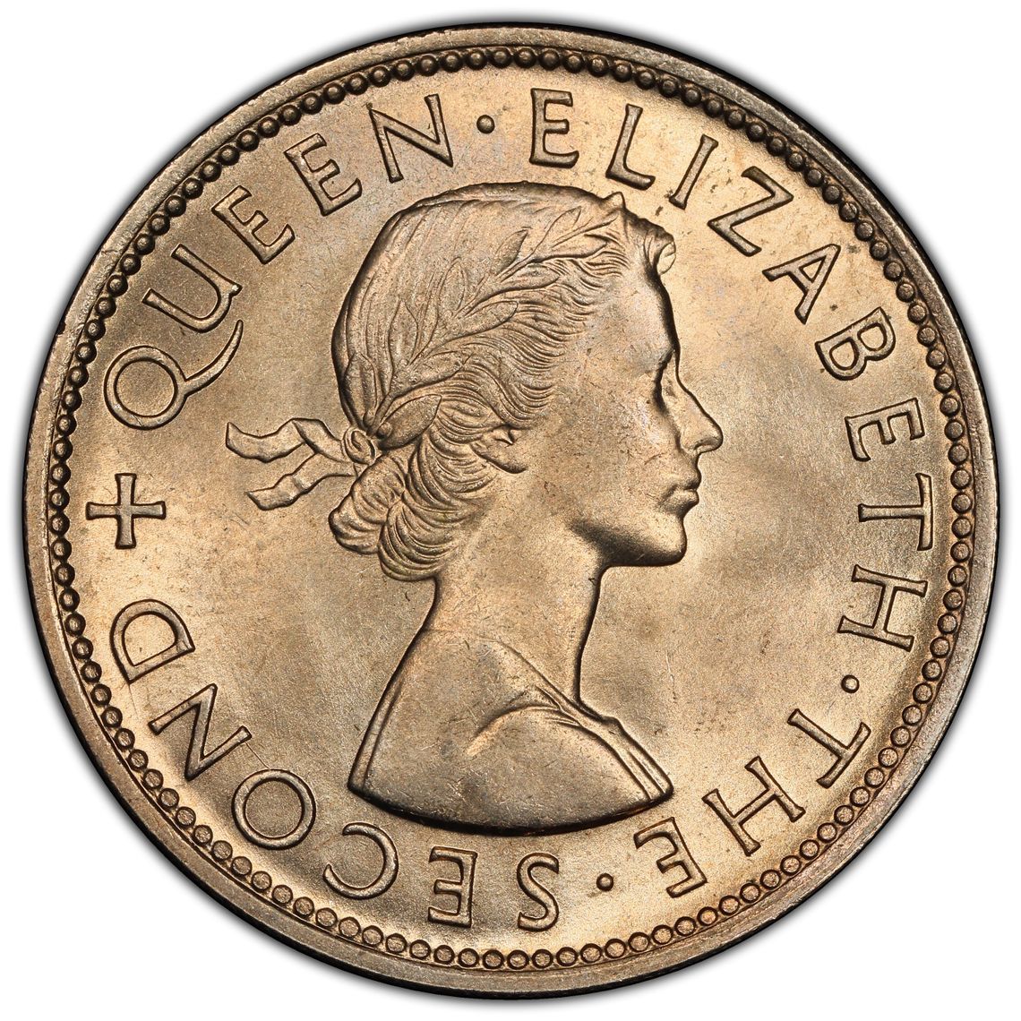 Опис: Бюст молодої лауреатки королеви Єлизавети II праворуч, навколо напис. Примітка: з ременем на плечі або без нього (див. нижче)