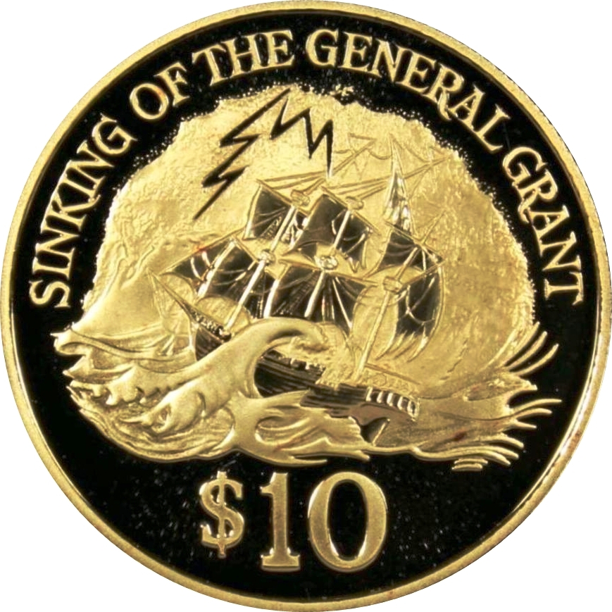 Назва: 10 доларів — Єлизавета II (3-й портрет; Затоплення корабля «Генерал Грант», золота пробна монета)