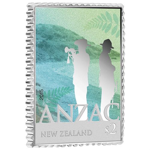 Опис: Силуети австралійського та новозеландського солдатів на тлі пляжу в бухті Анзак у кольорі з листям срібного папороті, легенда та номінал внизу.