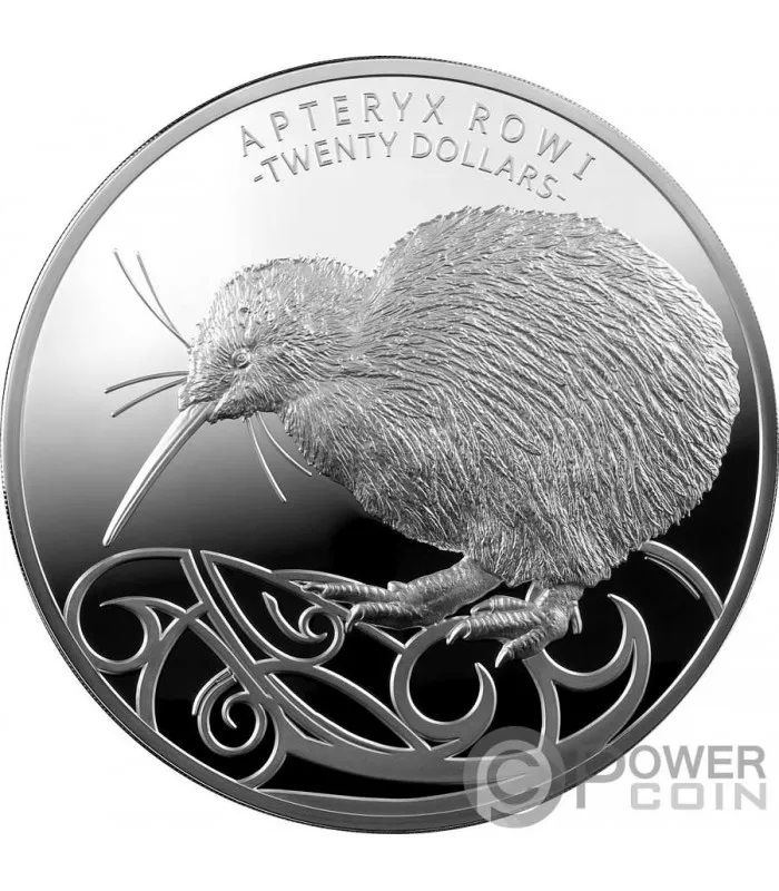 Опис: Ківі рові, що крокує вліво, над малюнками «кору» в стилі маорі, що символізують океани та ландшафти Нової Зеландії.