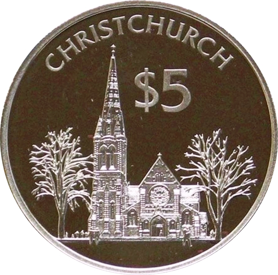 5 доларів — Єлизавета II (3-й портрет; Крайстчерч, срібна пробна монета)