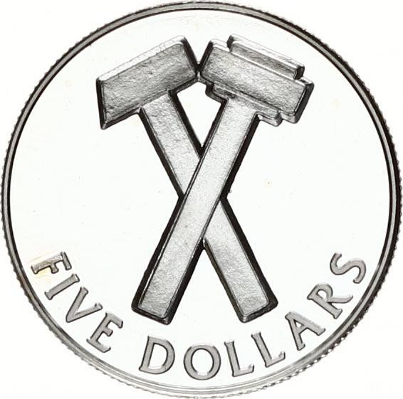 Назва: 5 доларів — Єлизавета II (3-й портрет; Схрещені молотки, срібна пробна монета)
