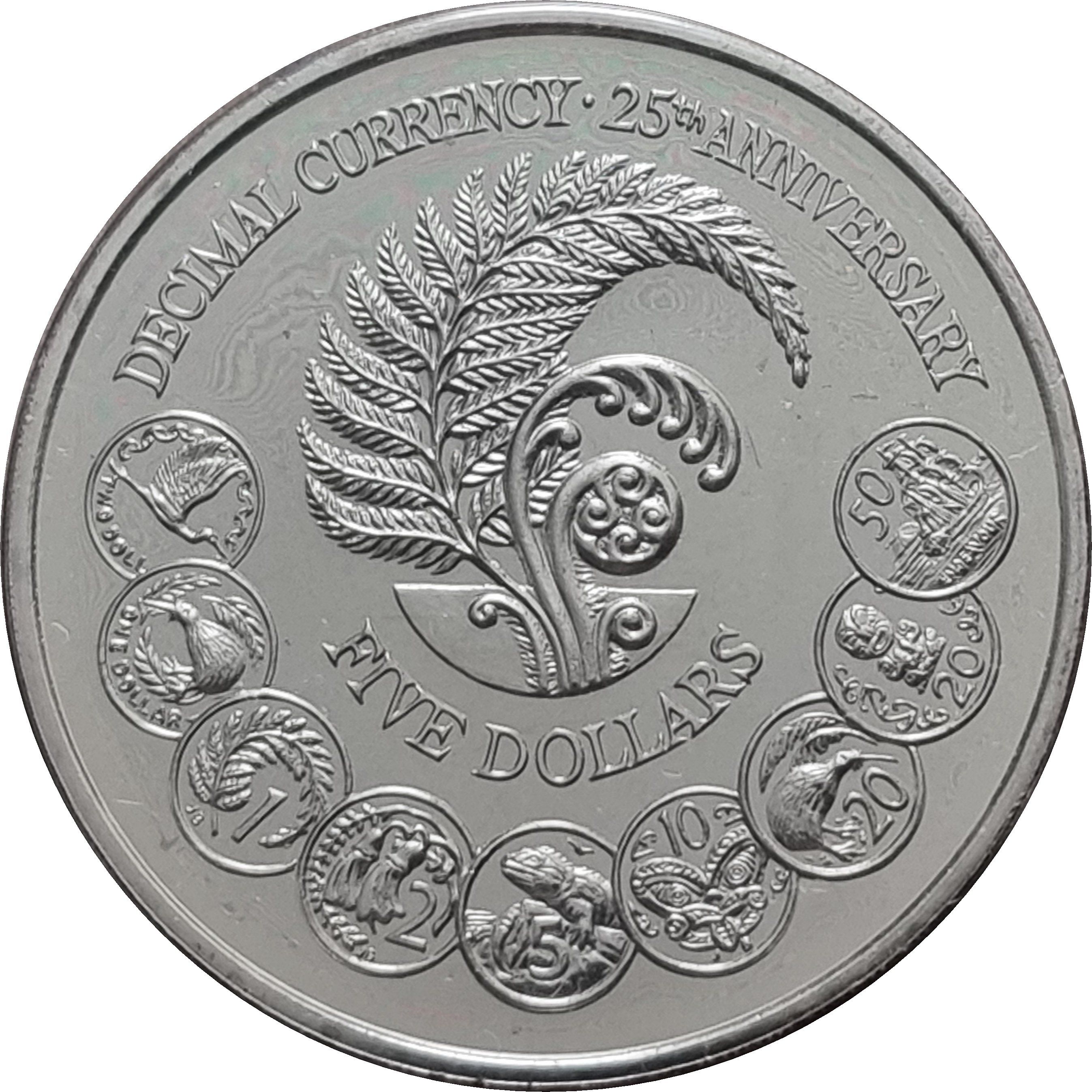 Опис: Срібний папоротевий лист над різними новозеландськими десятичними монетами, від 1 цента до двох доларів.