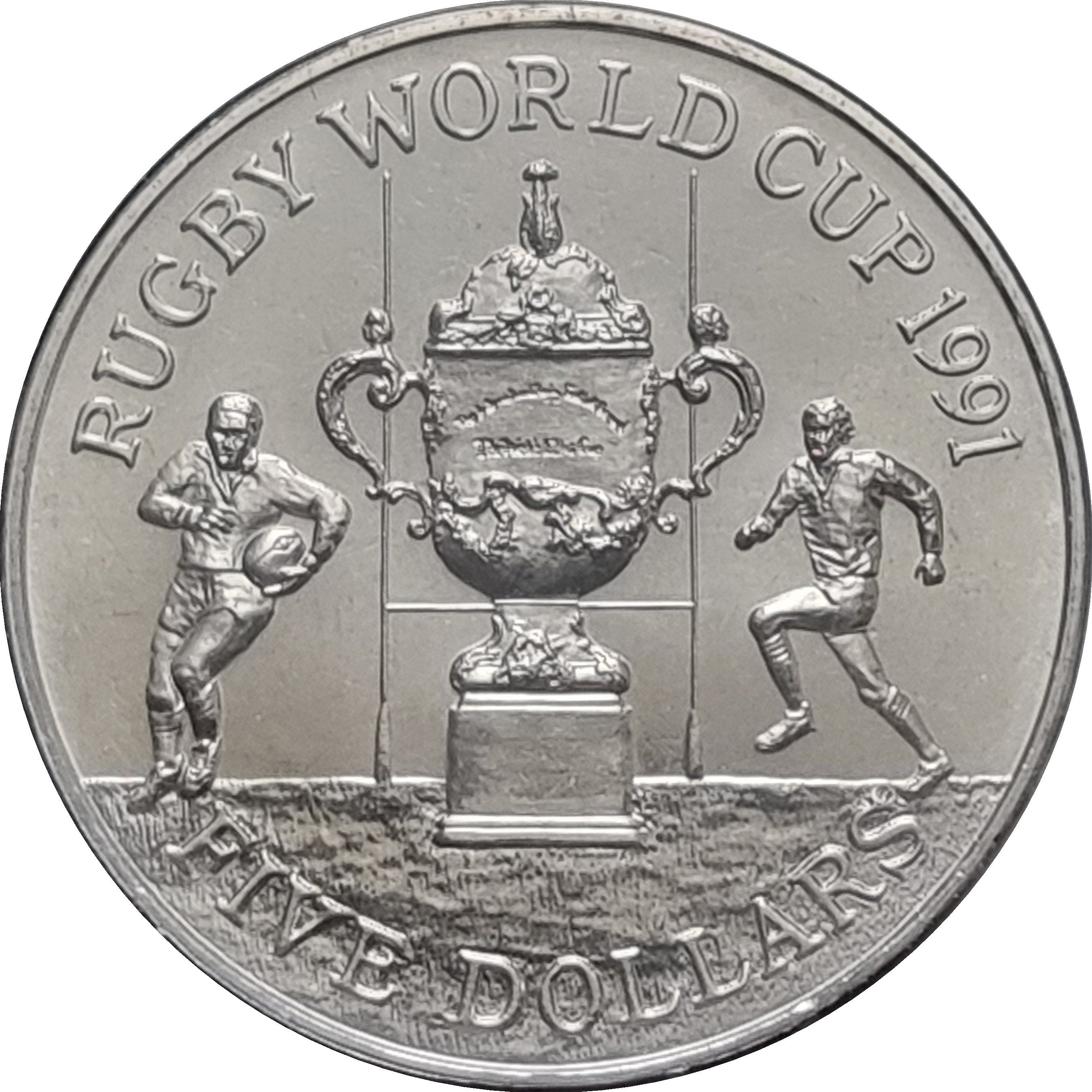 5 доларів — Єлизавета II (3-й портрет; Кубок світу з регбі) 1991 – 1991 Нова Зеландія
