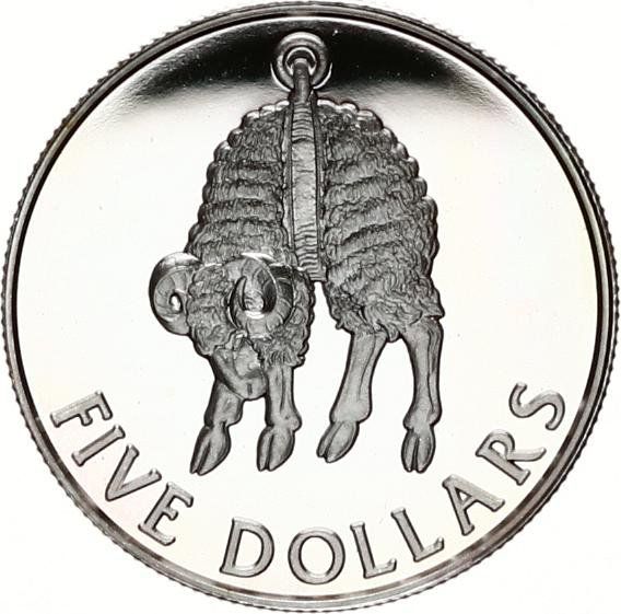Назва: 5 доларів — Єлизавета II (3-й портрет; овеча шерсть, срібна пробна монета)