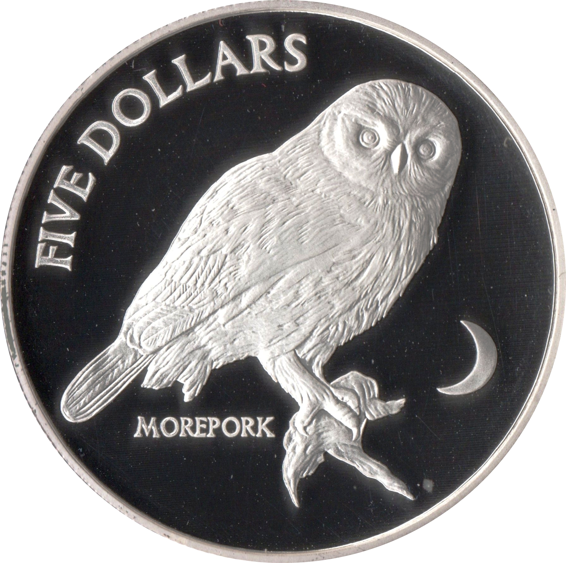 5 доларів — Єлизавета II (4-й портрет; сова-морепорк, срібна проба) 1999 – 1999 Нова Зеландія