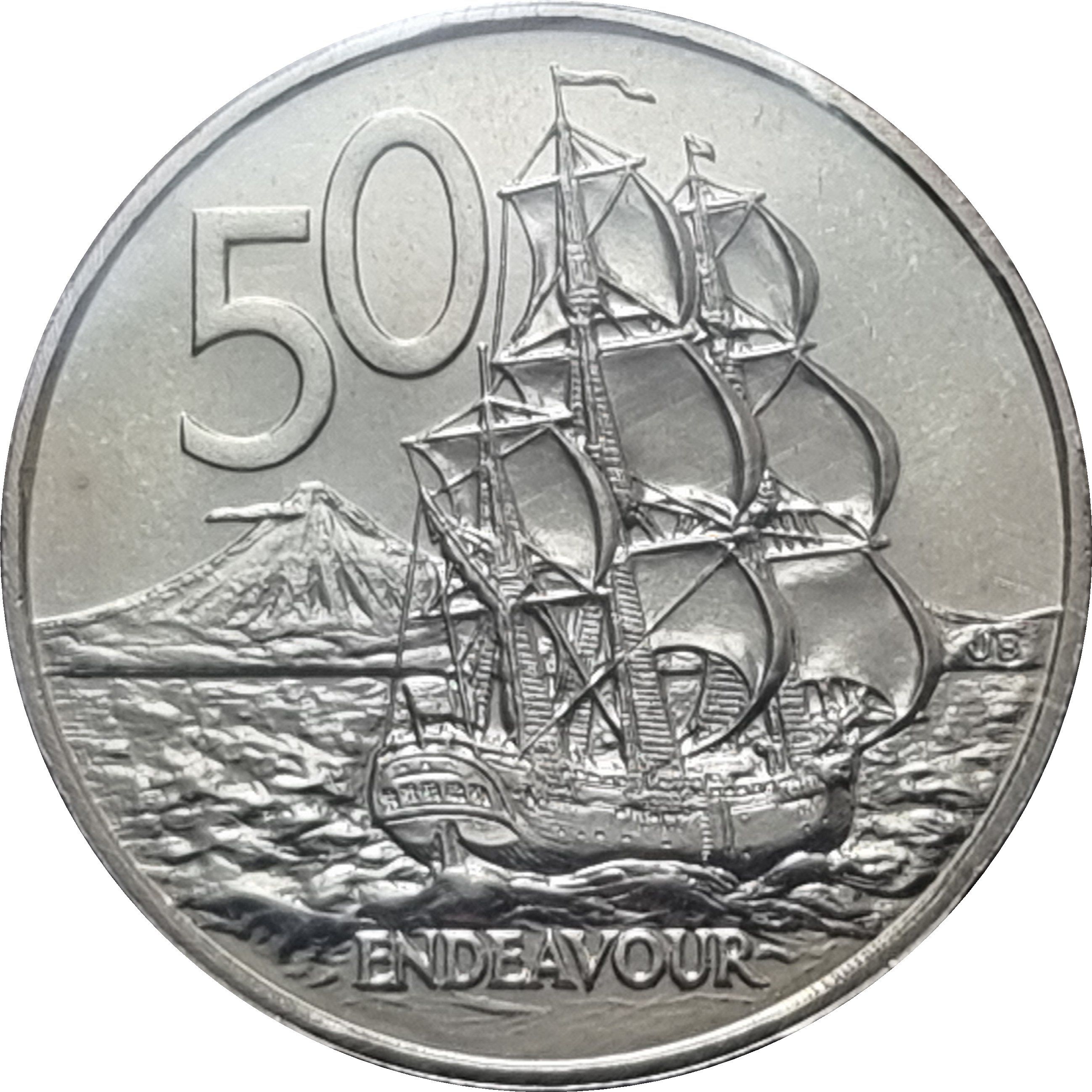 Опис: Барка HMS Endeavour, якою командував капітан Джеймс Кук під час своєї першої експедиції Тихим океаном у 1769-1771 роках, пливе праворуч, проходячи перед горою Таранакі (гора Егмонт), номінал вгорі ліворуч, легенда внизу.