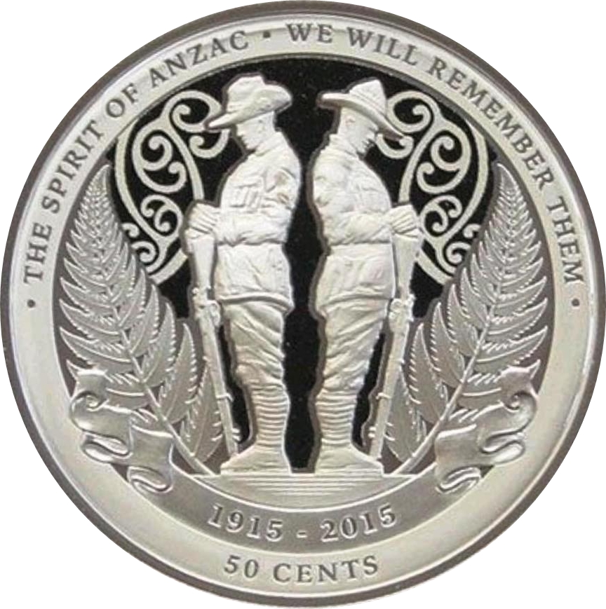 Опис: Солдати Нової Зеландії та Австралії з Мангопаре та срібним папоротем, напис навколо, дати та номінал знизу (символ Мангопаре зображує акулу-молот і символізує силу, рішучість, сильну волю та бойовий дух).