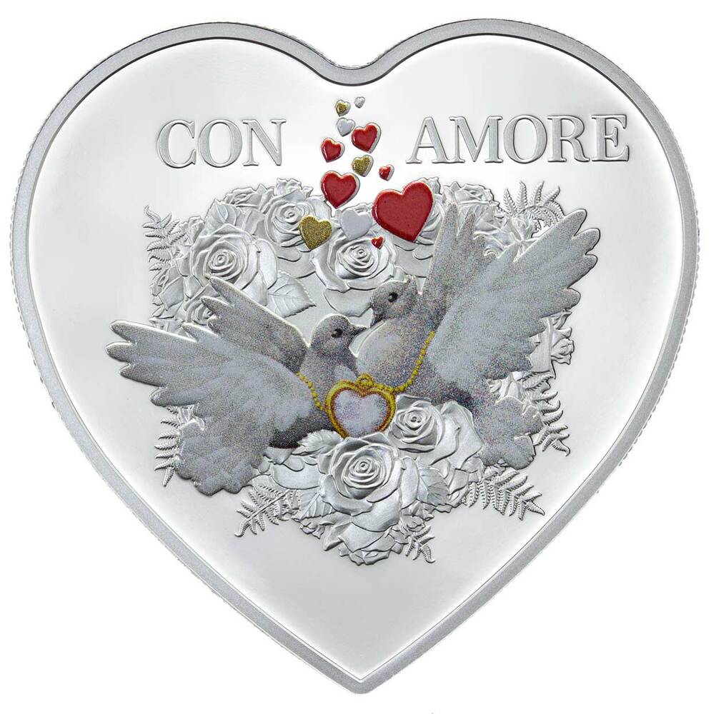 Опис: Дві голубки серед букета троянд, золотий ланцюжок, що з'єднує їх навколо шиї, з одним підвісом і різними за розміром і кольором сердечками, що пурхають над ними.