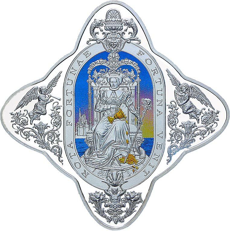 Опис: Дама Фортуна, одягнена в розкішні шати, сидить на оздобленому троні. Трон символізує силу і могутність Фортуни. В одній руці вона тримає золотий кубок, з якого висипаються золоті монети, символ матеріального багатства. В іншій руці Фортуна тримає чарівний жезл, символ успіху і щасливих подій.