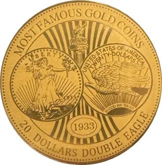 Опис: Аверс і реверс золотої монети номіналом 20 доларів. У верхній частині зображено факел, по краю — обідок з бусинками.